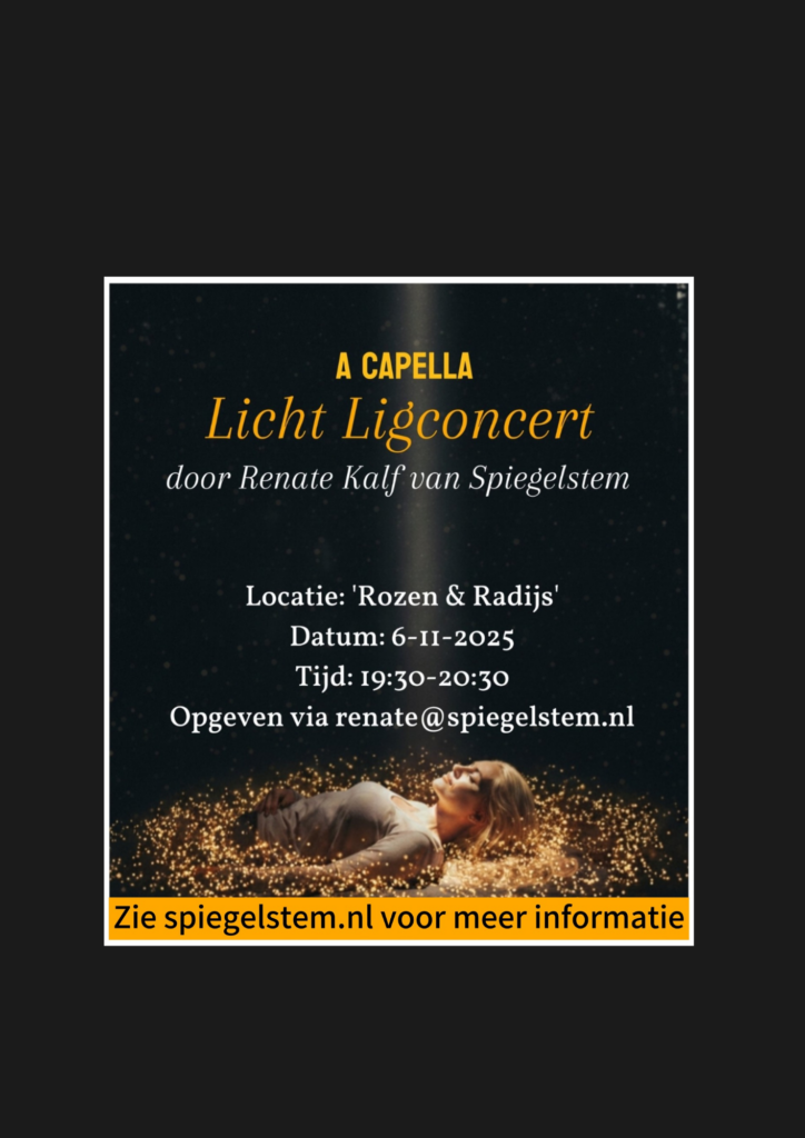 Kom naar mijn Licht Ligconcert en dompel je onder in een bad van intuïtief afgestemde ‘zangklanken‘. Laat alle drukte van de dag van je afglijden terwijl je heerlijk ligt en luistert. Mijn stem leidt jou naar een plek waar je volledig kunt ontspannen.